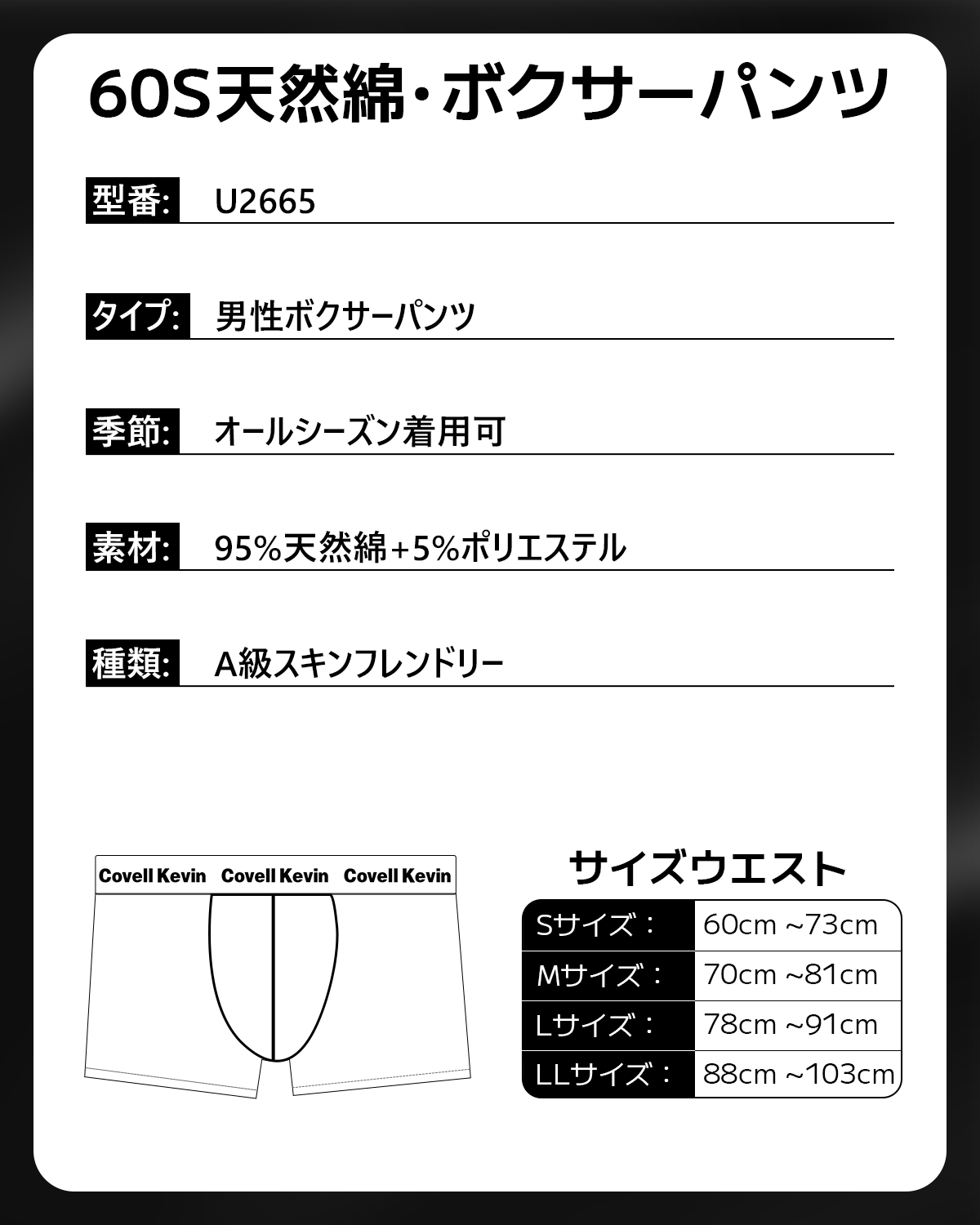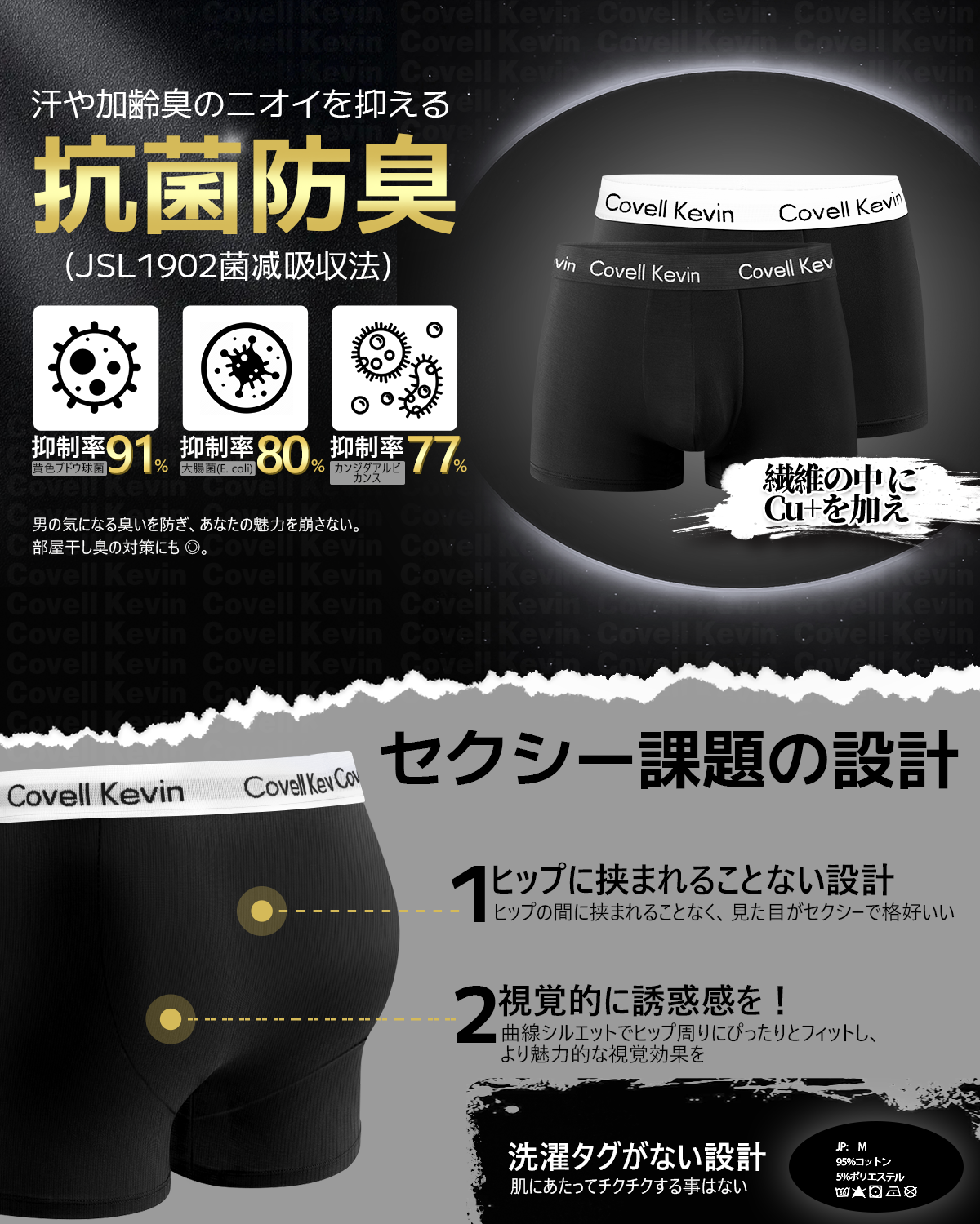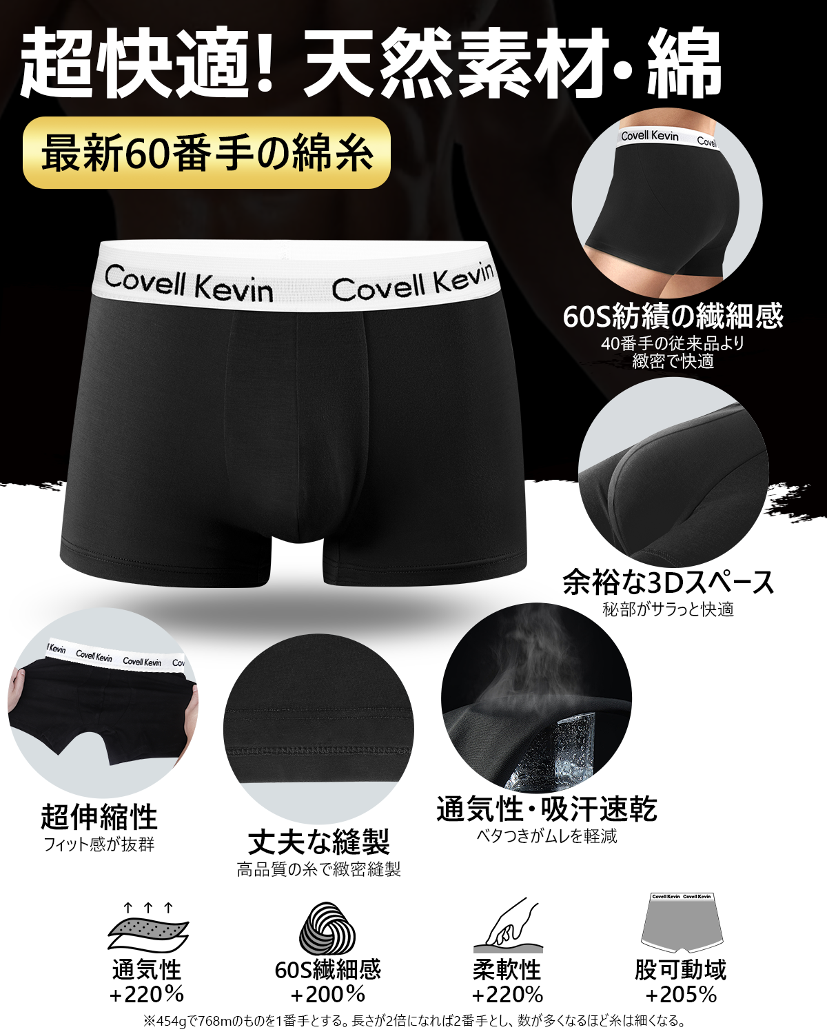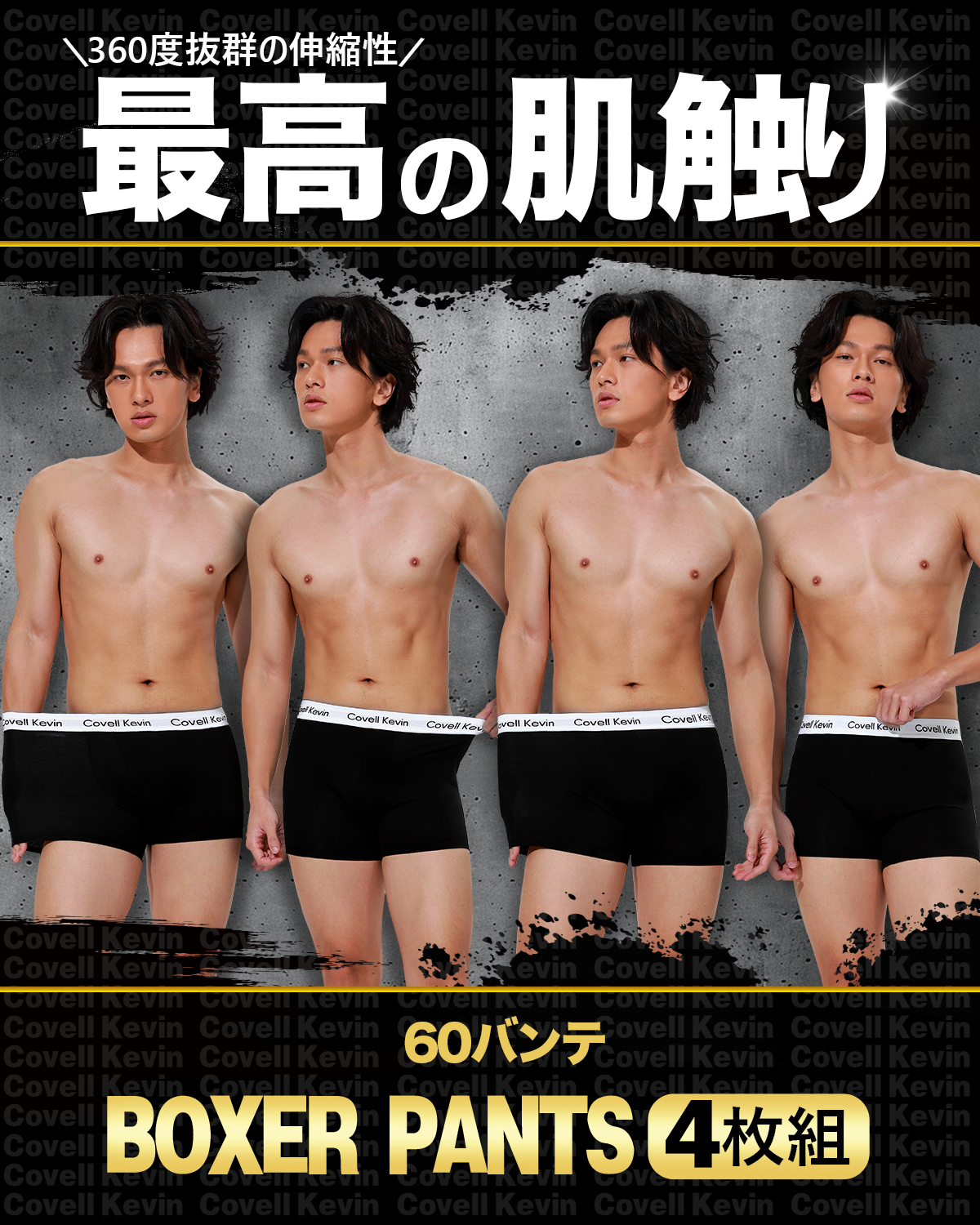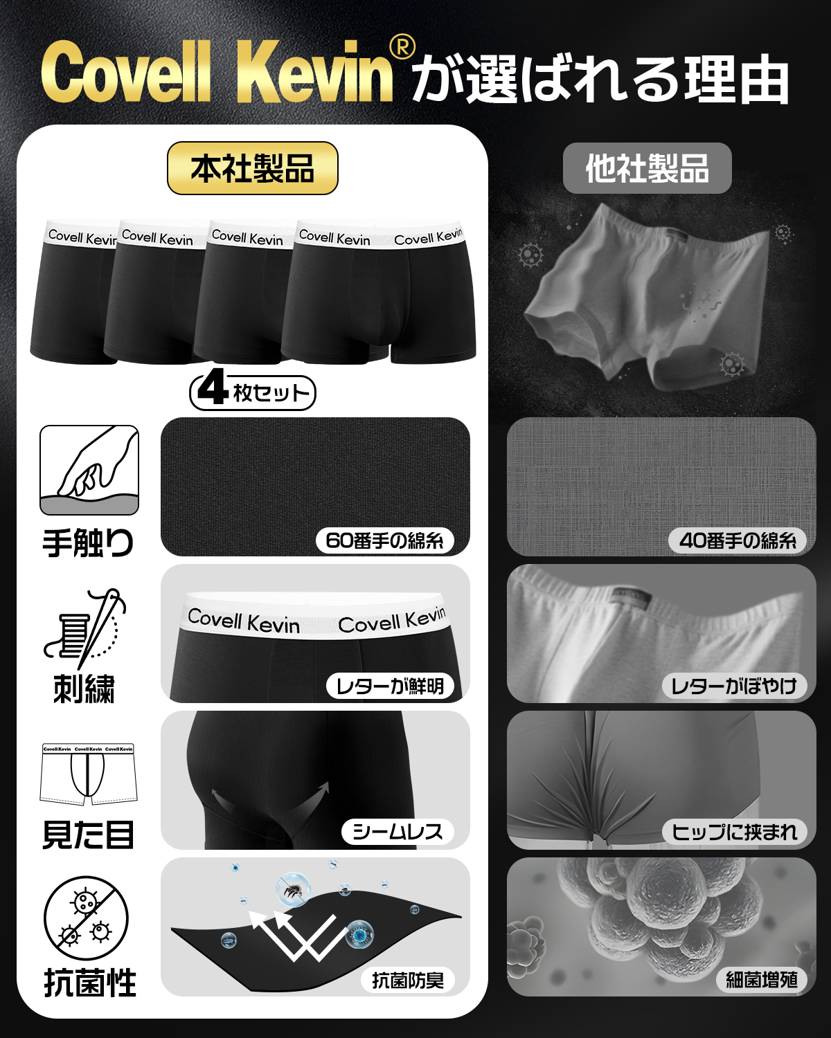 ボクサーパンツ 4枚セット 抗菌防臭 吸汗速乾 60S天然綿 ボクサーブリーフ 前閉じ ローライズ パンツ 日本国内企業/電話サービス/無条件で返品可 Covell Kevin