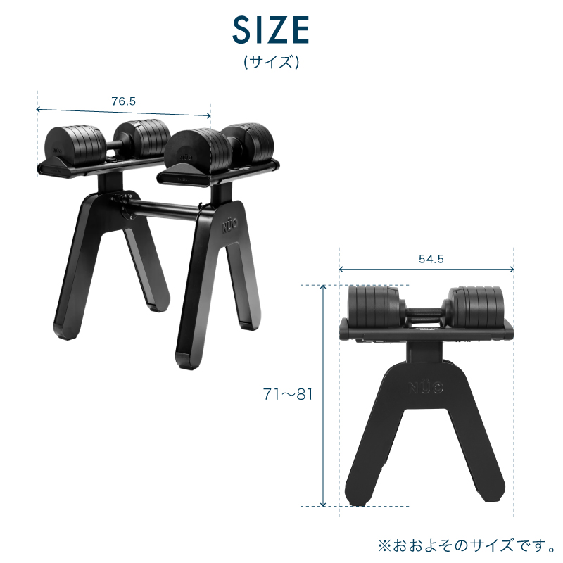 | 本体サイズ | W76.5cm × D54.5cm × H71~81cm (ダンベル2個 + 専用スタンド) |