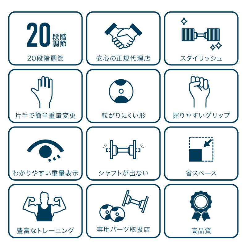 | 注意事項 | ・ダンベル1個につき、最大で約1kgの誤差が生じます。ご理解の上ご注文ください。 ・使用後は汗を拭き取るなど行ってください。 ・ご自身に合った無理のないトレーニングを行ってください。 ・ご使用になる場合は、肌の露出を極力避け、トレーニングに適した服装で行ってください。 |
