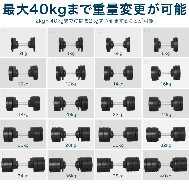 | 切替重量 | 2kg-4kg-6kg-8kg-10kg-12kg-14kg-16kg-18kg-20kg-22kg-24kg-26kg-28kg-30kg-32kg-34kg-36kg-38kg-40kg(20段階)/td> |