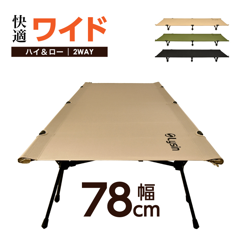 幅78cmのコットです。横幅が広いので、大柄な人でも心地よく眠ることができます。ハイタイプとロータイプ2通りの使い方ができるので、用途に合わせて使い分けることができます。フレームには高い強度と耐久性を備えた超々ジュラルミンを採用。さらに軽量でコンパクトに折りたためて、肩掛け可能な収納袋付きなので持ち運びもラクラクです。