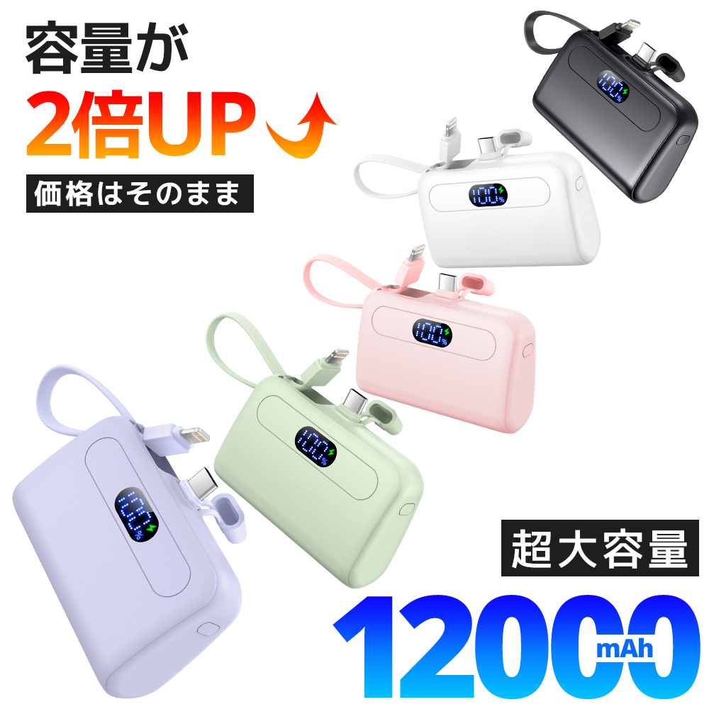 モバイルバッテリー 小型 12000mAh 大容量 2.1A急速充電 超ミニ 充電器 2台同時充電 Type-C Lightning ケーブル内蔵 超軽量 スマホ充電器 iPhone Android 対応