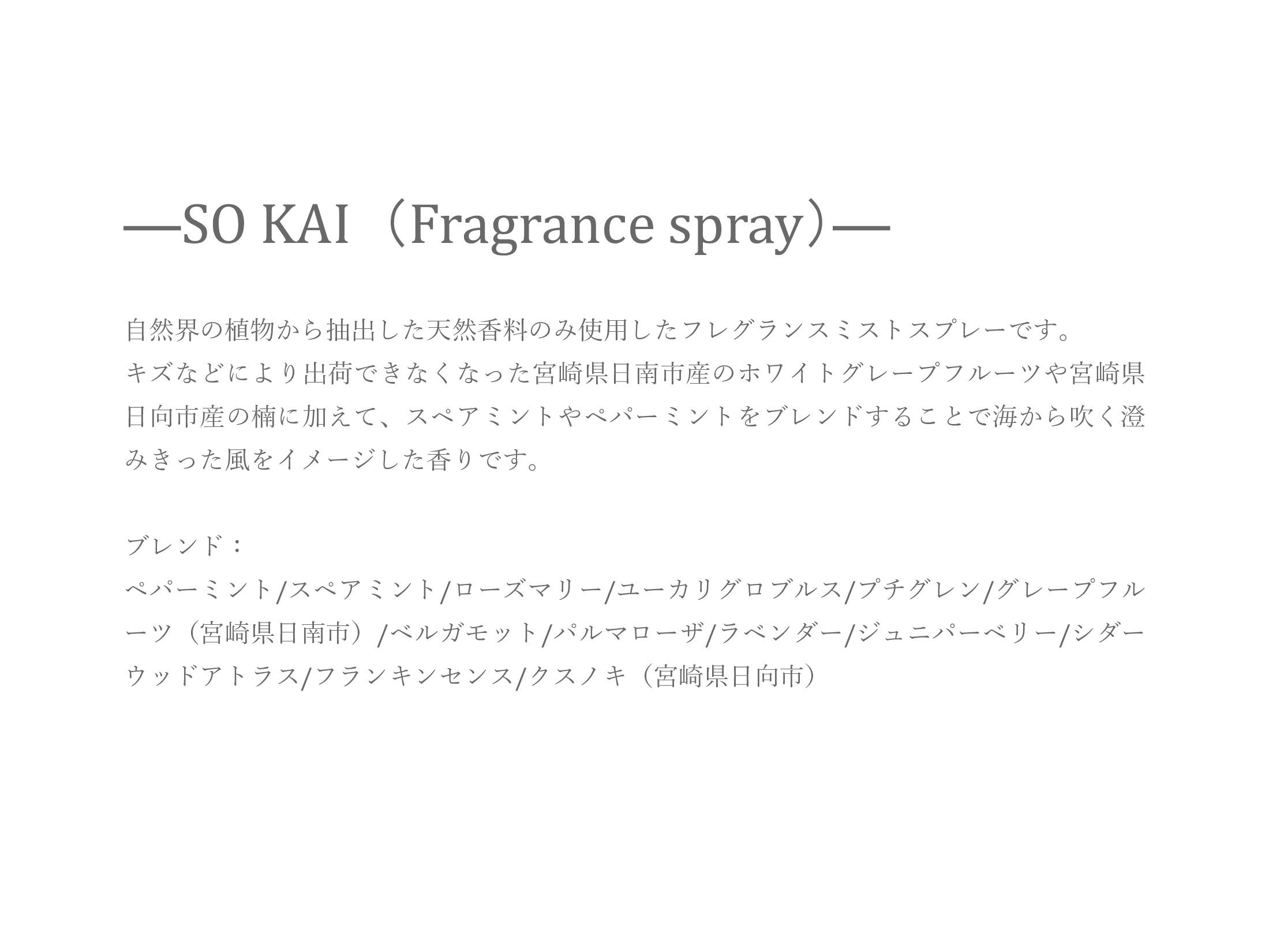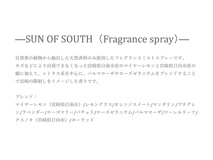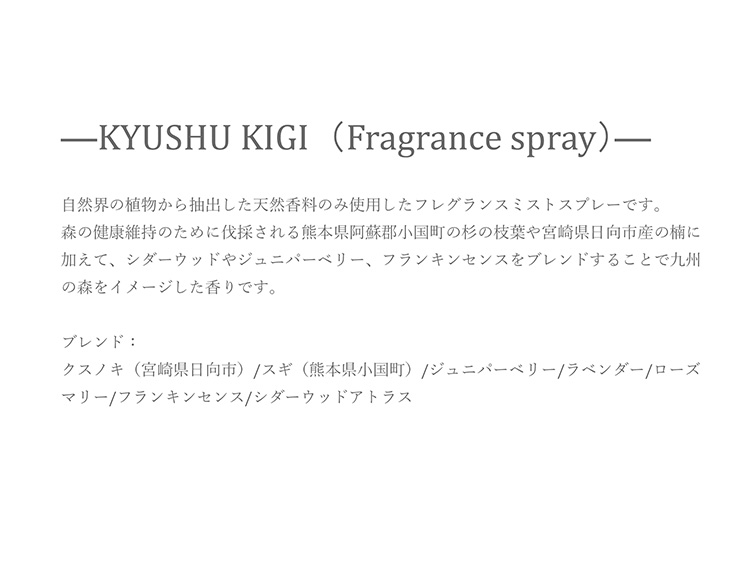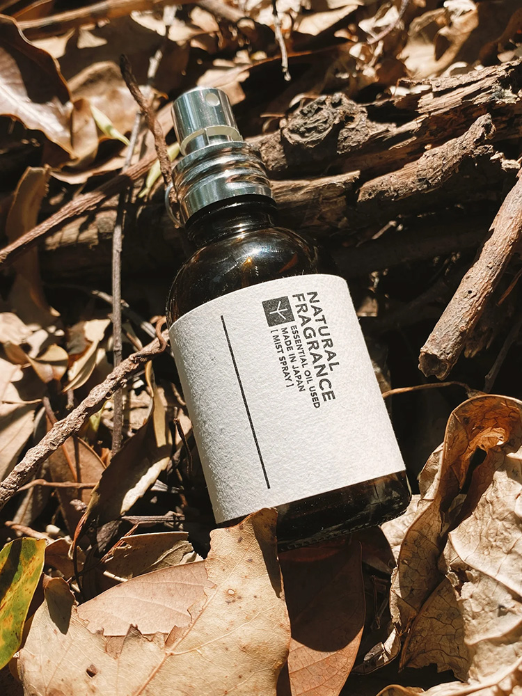 天然香料を100%で、エタノールもさとうきび由来のものを使用しております。人口香料を使用した香りに比べ、穏やかで日本人の感性に馴染む香りを意識しています。実際に足を運ぶことのできる九州各地の樹木やハーブ、柑橘などを原料として積極的に使用しています。