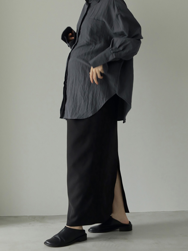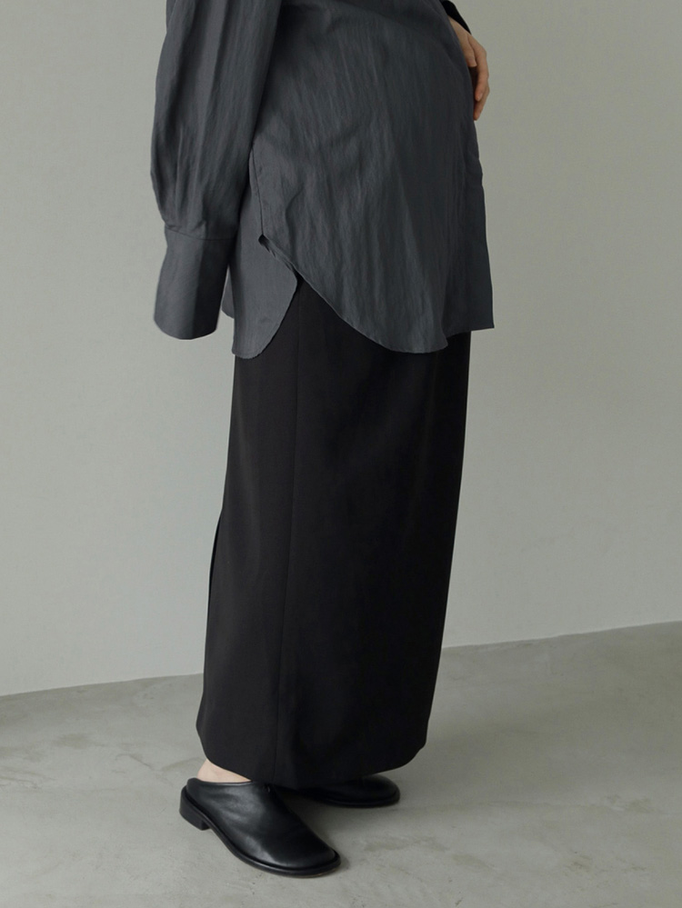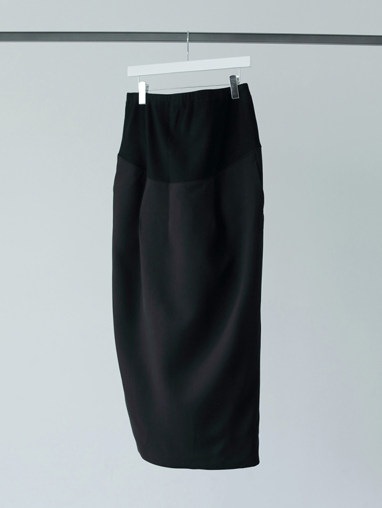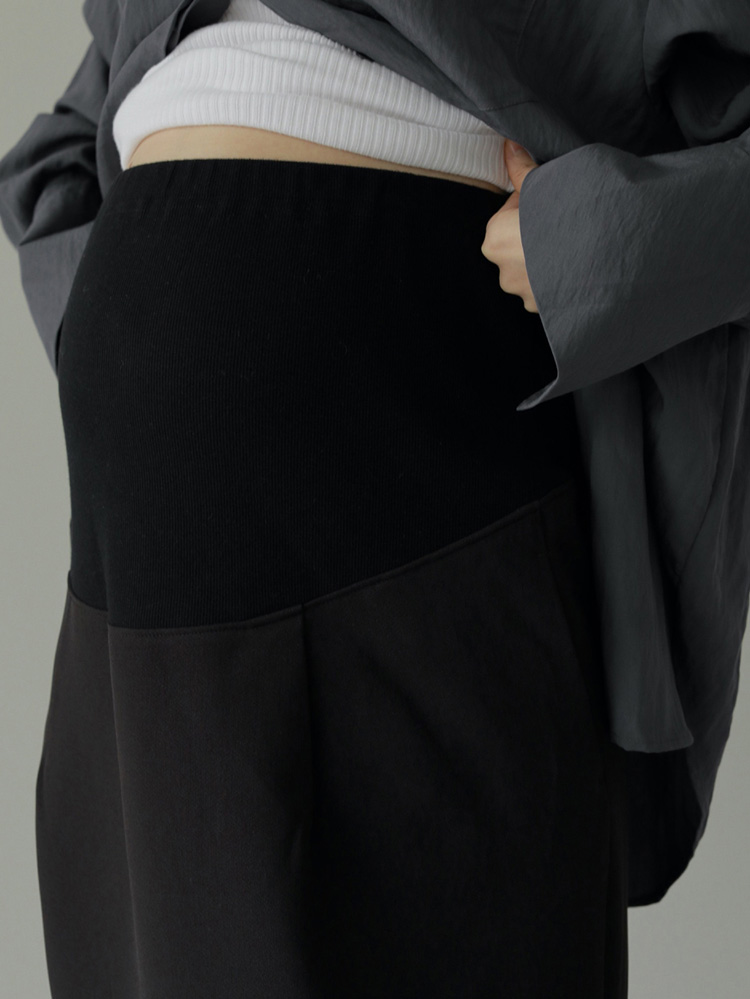 マタニティスカートです。ウエストはリブですっぽりと包み込んでくれます。内側に調整のゴムが入っているのでお腹の大きさにもよりますが臨月まで穿いてもらえると思います。ストレスなく妊婦さんにもお洒落を楽しんでもらいたくて作ったスカートです。