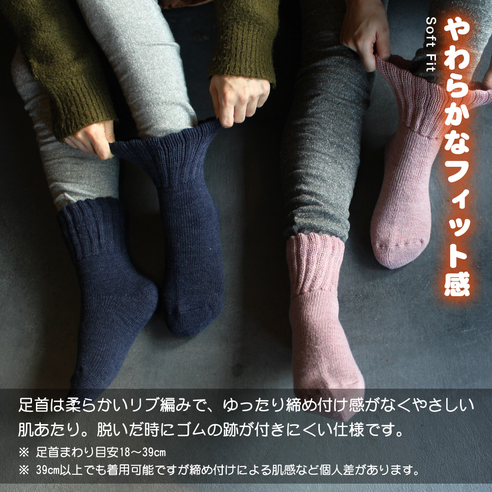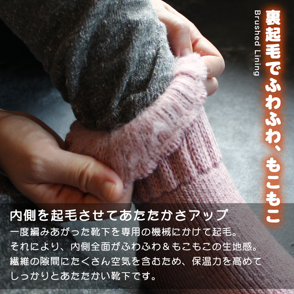| 裏起毛で温かく厚みもある、ブランケットを履いたような靴下です。アクリルなどあたたか素材でできている靴下は、秋冬の寒い時期には手放せない存在に!モコモコっとしているので部屋履きにも最適です。 温感加工裏起毛タイプのブラック、ベージュ、グレーと通常裏起毛タイプの杢ピンク、オリーブ、マスタード、レッド、ネイビーの2種類からお選びいただけます。 |