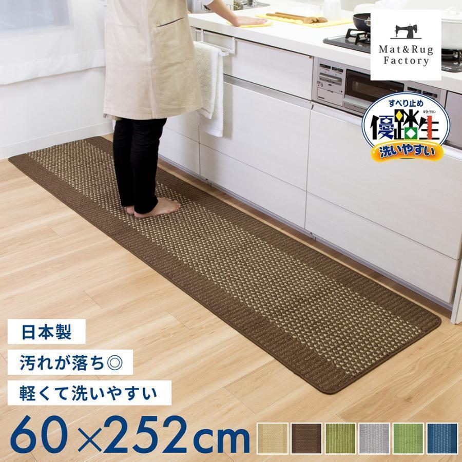 ・サイズ:約60×252cm(マットの高さ約8mm) ・品質:ポリプロピレン100% ・裏面滑り止め加工 ・丸洗い可能 ・日本製 ・カラー:ベージュ、ブラウン、グリーン、グリーン(ヘリンボン)、グレー(ヘリンボン)、ネイビー(ヘリンボン)