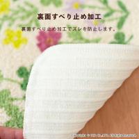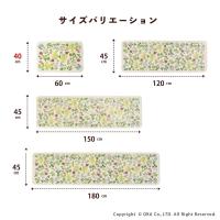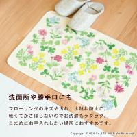 野原に咲く小さなお花をモチーフにしたポップでかわいいイラストのキッチンマット。サラサラの肌触りが特徴の薄手のマットです。洗面前やキッチンなど様々な場所に敷いても引き出しなどに引っかかりにくく使う場所が広がります。毛羽立ちが少なくお手入れも簡単です。裏面はすべり止め加工がされています。へたりにくいしっかりとした縫製、丸くカットした角はマットが浮き上がりにくいようになっており、足元がひっかかりにくく安心です。
