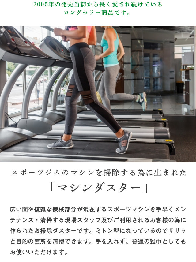 広い面や複雑な機械部分が混在するスポーツマシンを手早くメンテナンス・清掃する現場スタッフの為に作られたお掃除ダスターです。