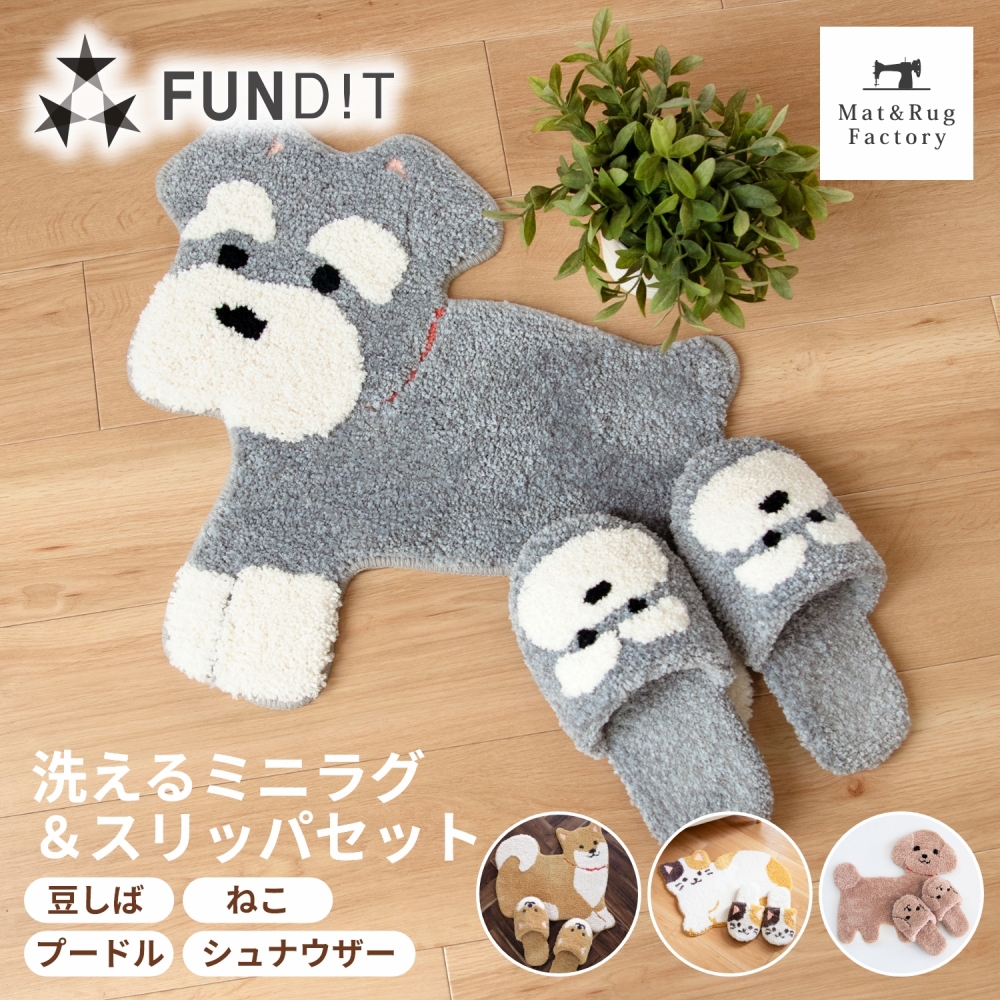 マット 洗える ラグ+スリッパ 2点 セット ファンディット アニマル かわいい フリーマット アクセントラグ シュナウザー 洗濯可 あったか スリッパ オカ