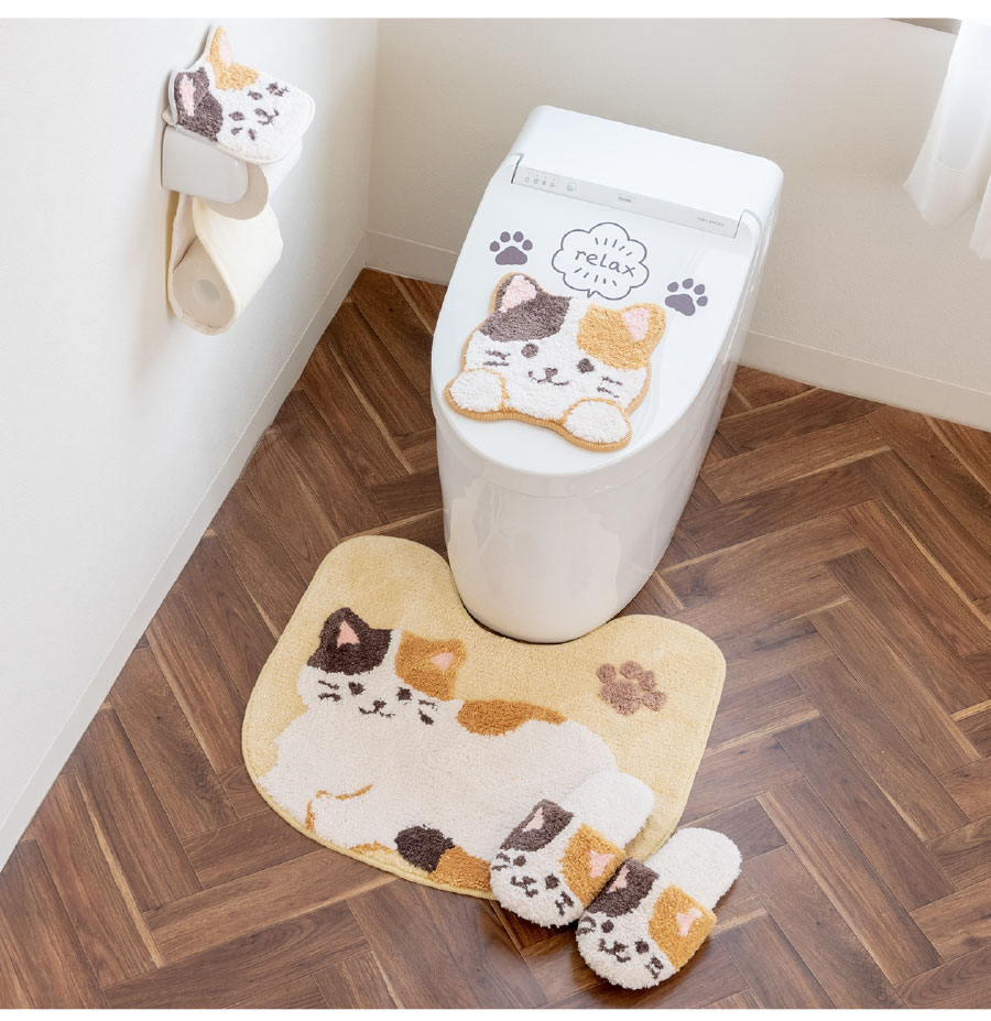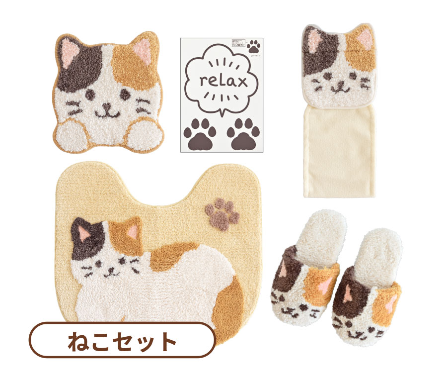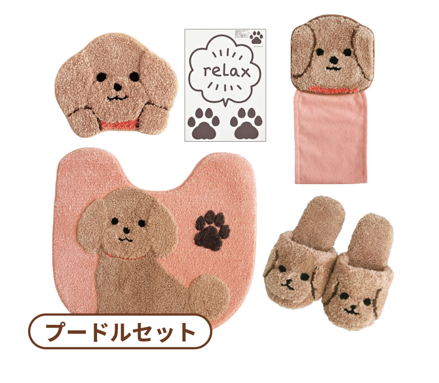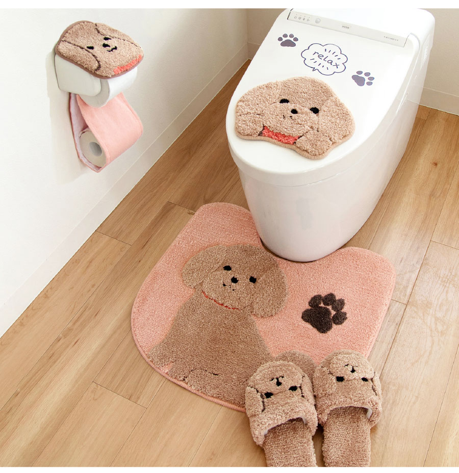 もこもこ可愛い「ファンディット アニマル トイレタリー」シリーズのお揃いのトイレマット、デコレーションマスコット、スリッパ、トイレットペーパーホルダーカバー、消臭シールの5点セット。