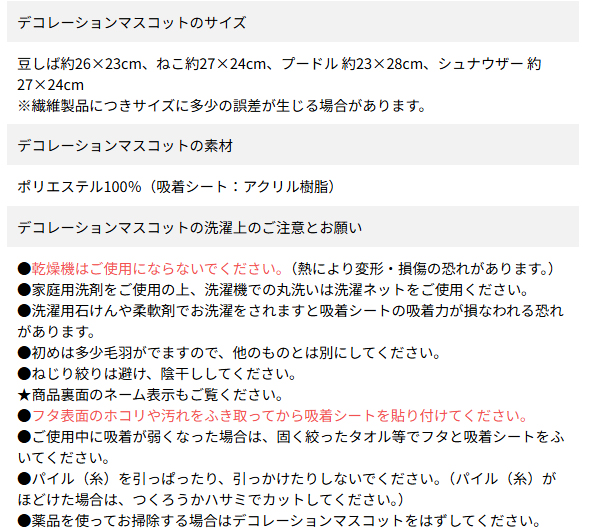 ・サイズ:豆しば約26×23cm、ひつじ約25×26cm、ねこ 約27×24cm、プードル 約23×28cm、シュナウザー 約27×24cm ・素材:ポリエステル100%(吸着シート:アクリル樹脂) ・洗濯可 ・中国製