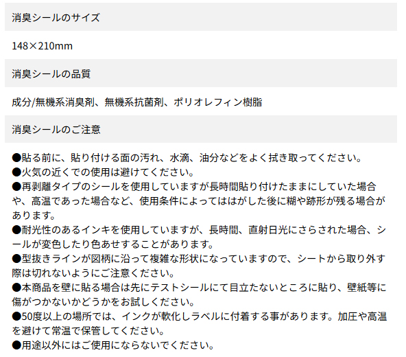 ・サイズ:148×210mm ・品質:成分/無機系消臭剤、無機系抗菌剤、ポリオレフィン樹脂 ・用途:トイレ・室内用 ・日本製