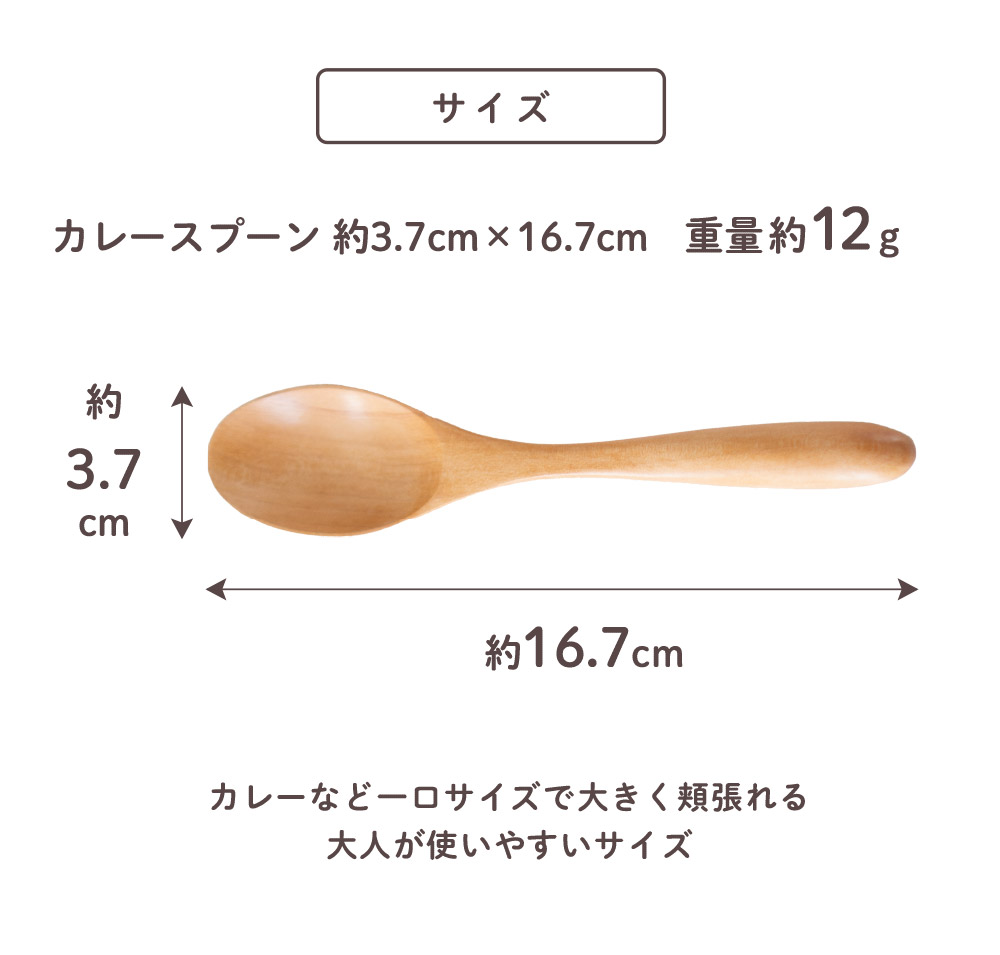 本来捨てられるはずの端材、廃材を活用した環境に配慮した天然木スプーン。扱いやすい軽さと、手にしっくりとくるカーブ。普段使いとしてさまざまなシーンで活躍できるシンプルなデザインで、天然素材本来の色味が楽しめるナチュラルカラー。硬さを感じやすい金属やガラス製食器とくらべ、見た目も質感もやわらかな天然木製カトラリーはしっくりとなじむ手ざわりとやさしくなめらかな口あたりで自然のぬくもりが感じられます。熱伝導率が低い木材は唇に触れた時に冷たくないのでお子様やご年配の方たちにもおすすめの食器です。ガラスコーティング塗装を施しているので家庭用食洗機対応しています。