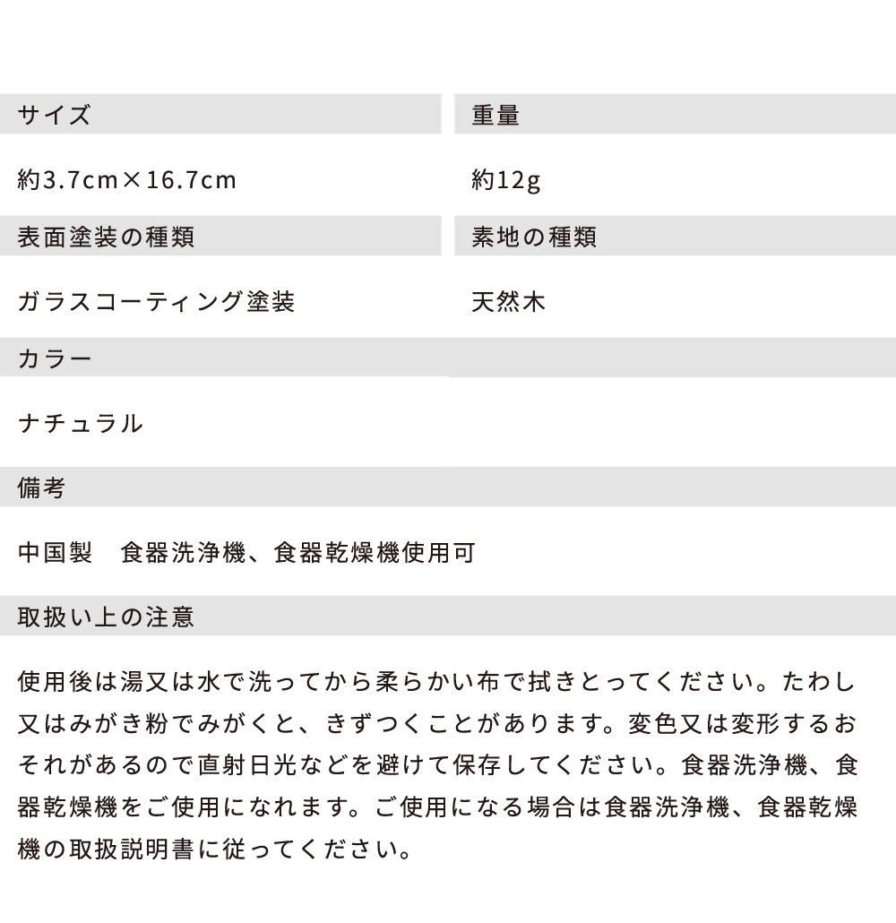 ・スプーン3本セット ・サイズ:約3.7cm × 16.7cm ・重量:約12g ・素材:天然木 ・中国製 ・ナチュラル ・家庭用食洗機対応