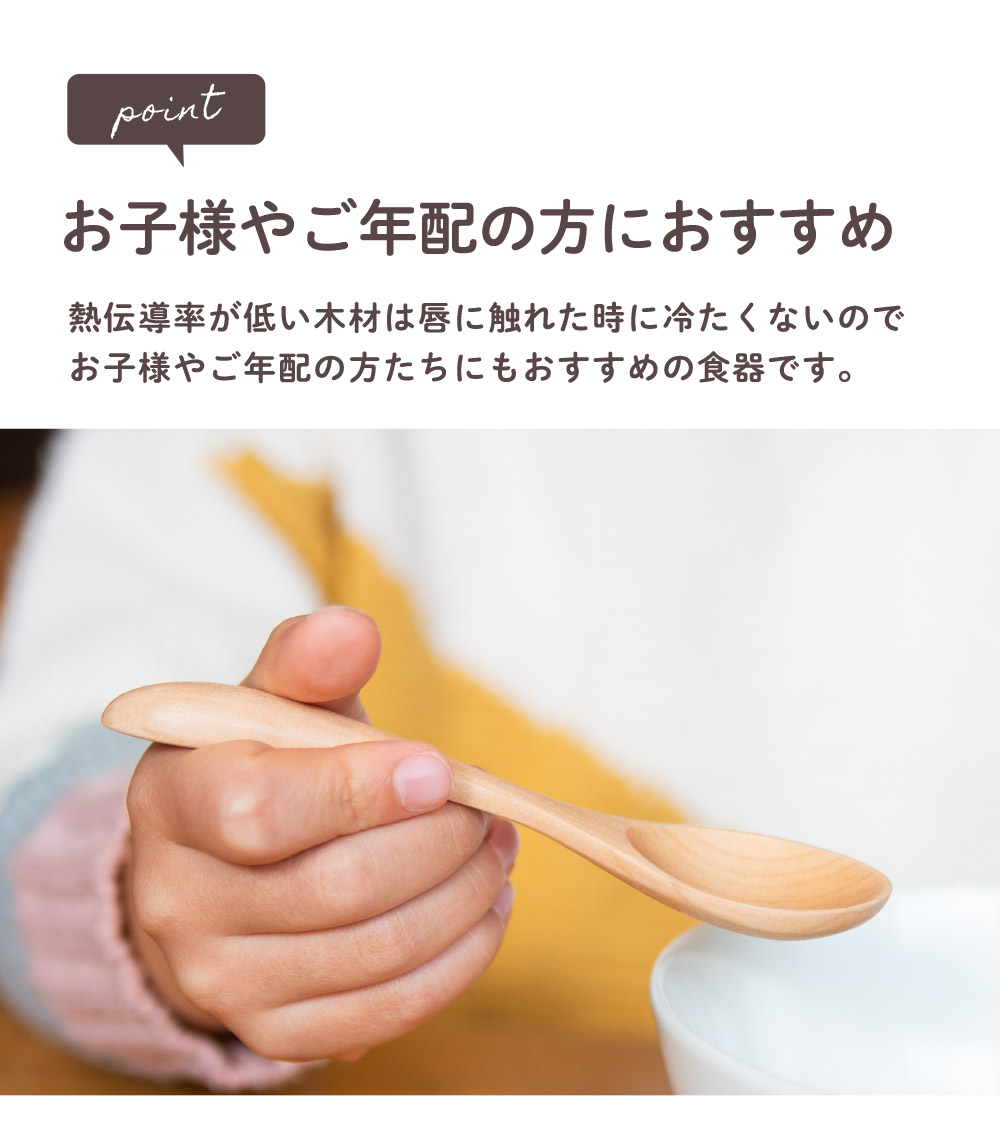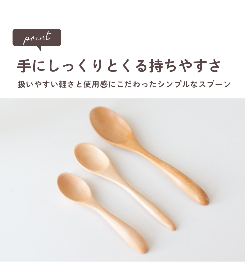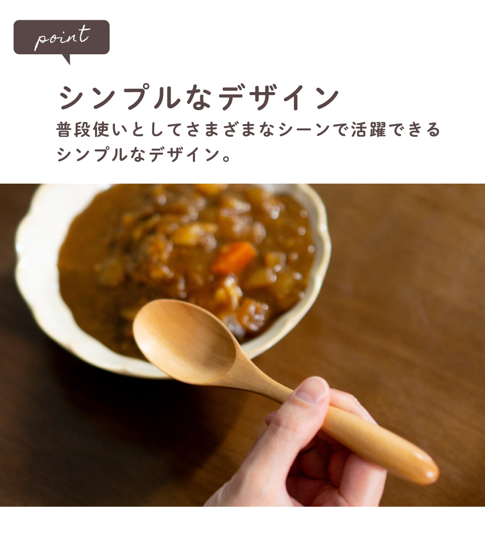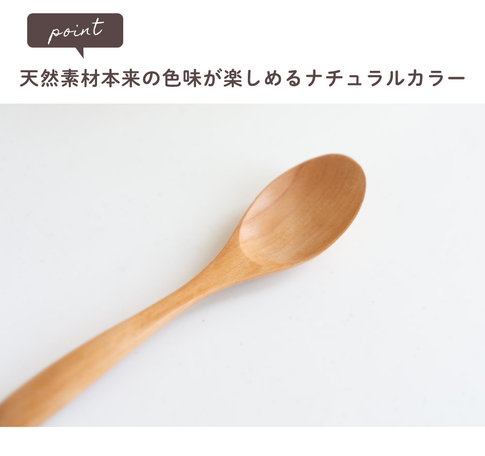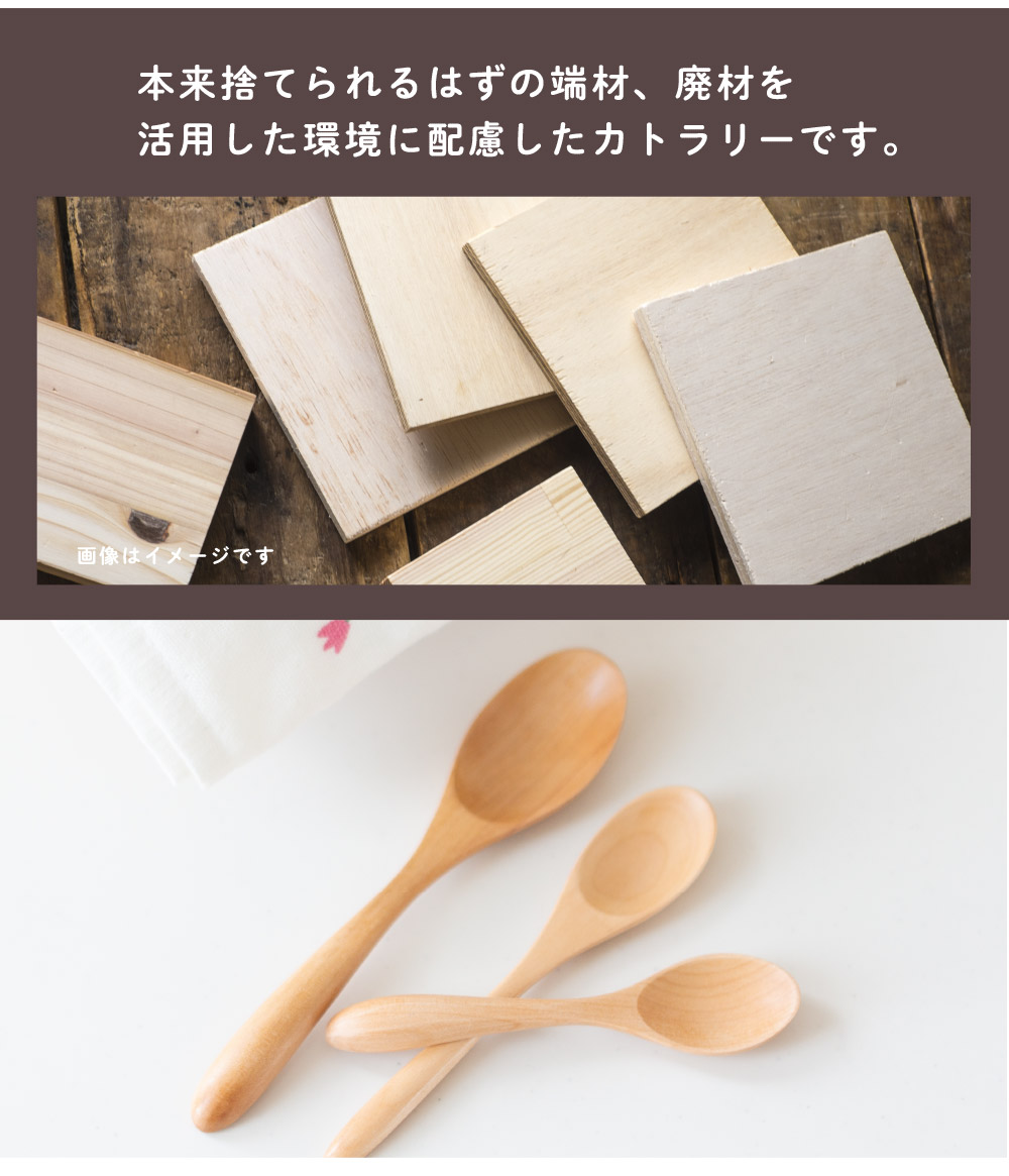 本来捨てられるはずの端材、廃材を活用した環境に配慮した天然木スプーン。扱いやすい軽さと、手にしっくりとくるカーブ。普段使いとしてさまざまなシーンで活躍できるシンプルなデザインで、天然素材本来の色味が楽しめるナチュラルカラー。硬さを感じやすい金属やガラス製食器とくらべ、見た目も質感もやわらかな天然木製カトラリーはしっくりとなじむ手ざわり」と「やさしくなめらかな口あたりで自然のぬくもりが感じられます。熱伝導率が低い木材は唇に触れた時に冷たくないのでお子様やご年配の方たちにもおすすめの食器です。ガラスコーティング塗装を施しているので家庭用食洗機対応しています。