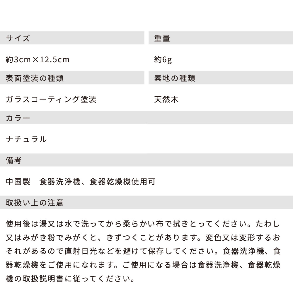 ・スプーン3本セット ・サイズ:約3cm × 12.5cm ・重量:約6g ・素材:天然木 ・中国製 ・ナチュラル ・家庭用食洗機対応