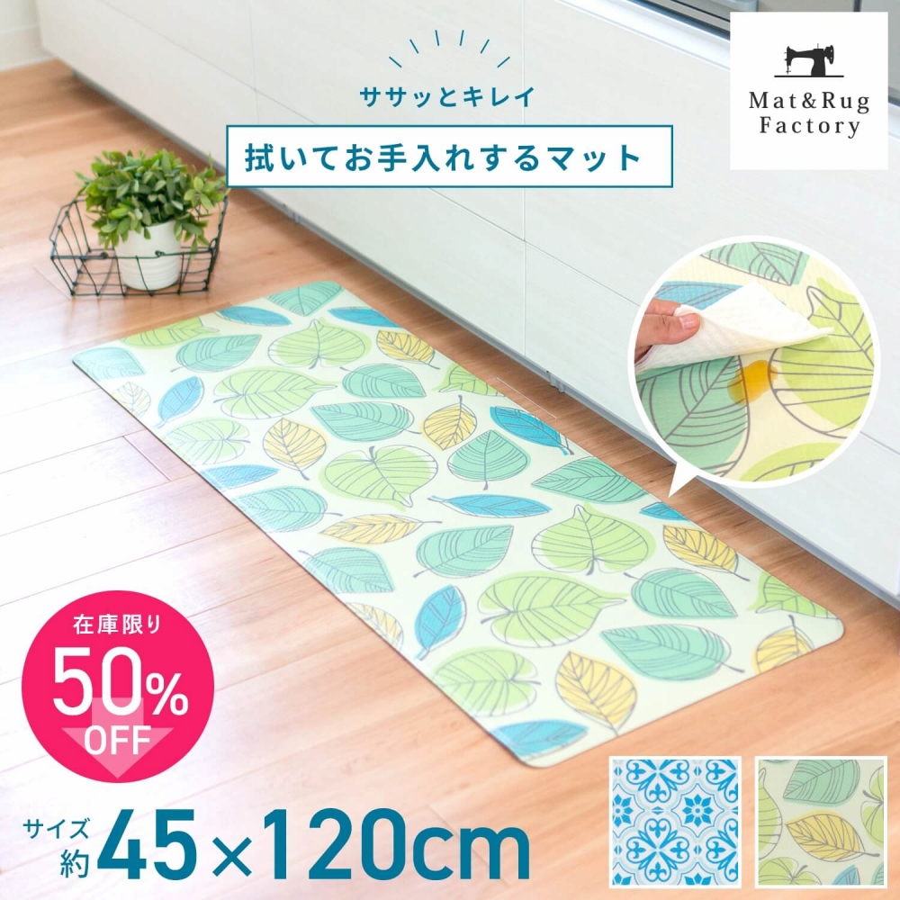 ・トイレマットサイズ:約45×120cm(マットの厚み約5mm)・素材:塩化ビニル樹脂 ・中国製 ・カラー:ブルー(タイル)、イエロー(リーフ)