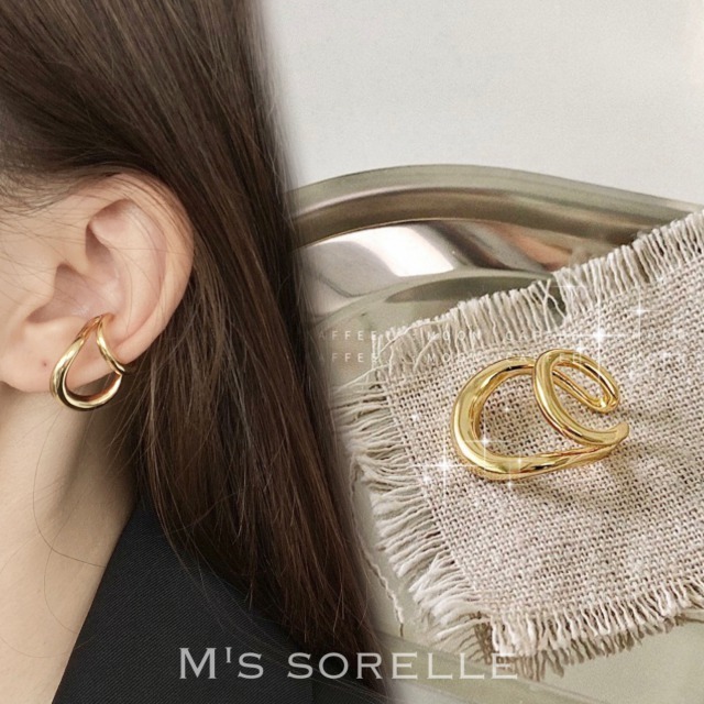 フープピアスを重ね付けしたようなダブルラインが、顔周りを大人っぽく見せてくれる存在感のあるイヤーカフ。
