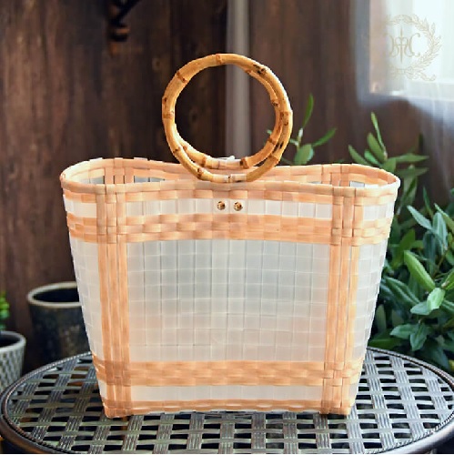 プラスチックバンドで編んだおしゃれで軽やかなかごバッグ。