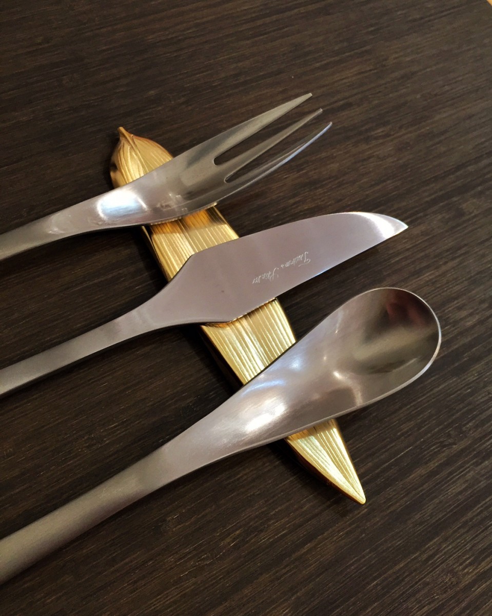 新潟県の燕市で作られているステンレス製の笹の形をしたカトラリーレスト(ナイフやフォーク置き)。意外とこのサイズのカトラリーレストはなかなか見当たりませんね。