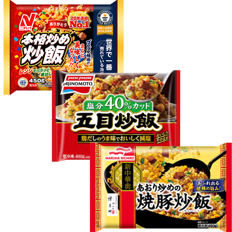 | ニチレイ本格炒め炒飯×1、味の素五目炒飯×1、マルハニチロあおり炒めの焼豚炒飯×1、計3袋 |