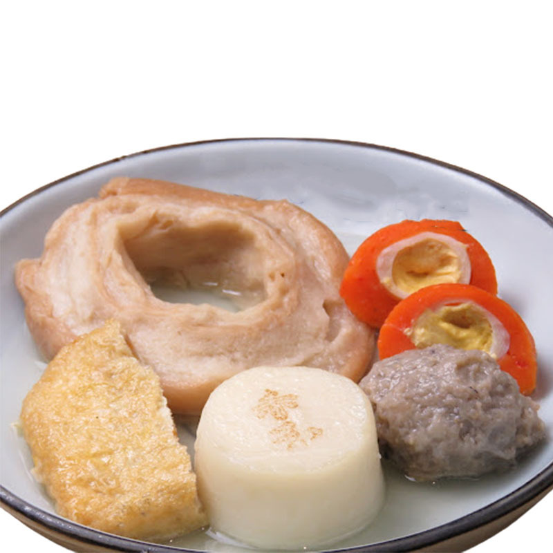 | にぎすつみれ×1、肉いなり×1、車麩×1、赤玉ばくだん×1、海老しんじょう×1、出汁150ml |