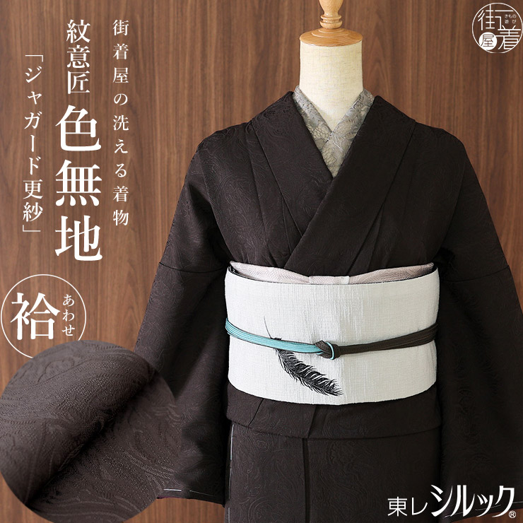 陰影のある深い焦げ茶色は、繊細な地紋が引き立つ絶妙なバランス。小物とも合わせやすく、年齢を問わず着こなしやすい色合いです。着物の生地色に合わせたシックな濃紫色の八掛は、上質でまろやかなタッチが心地良い東レ素材を使用しています。