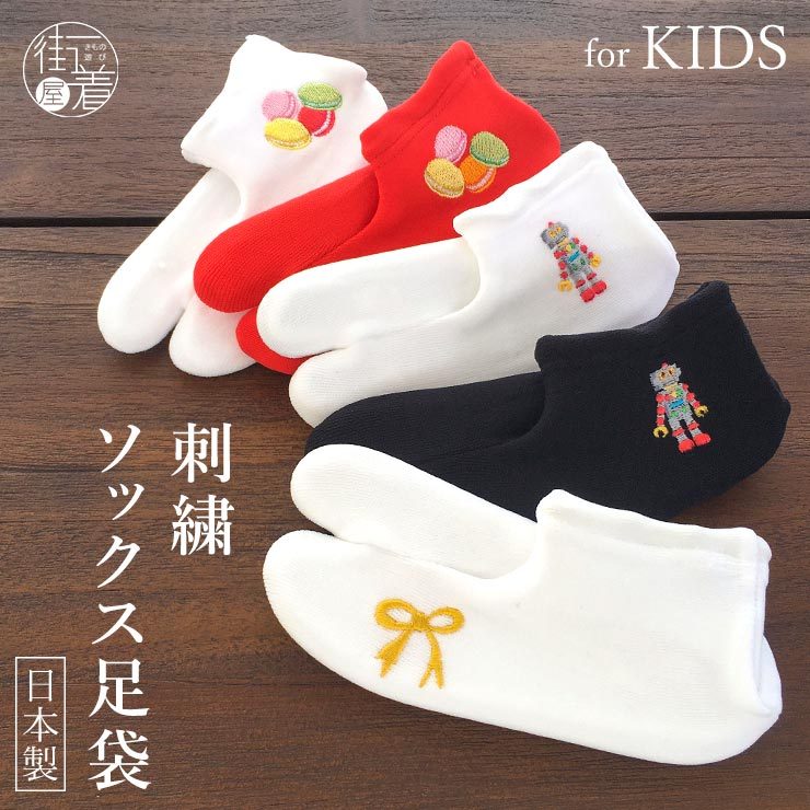 | 足元まで可愛くお洒落に!こども向けのソックスタイプの刺繍入り足袋 せっかくの特別な一日。晴れ着に合わせて、足袋までこだわってみませんか? 見た目の可愛さはもちろん、機能性もバッチリ。こはぜという金具のないソックスタイプなので、靴下感覚で着脱することができます。さらに底面にはすべり止め付きで、小さなお子様でも安心して履いていただけます。 |