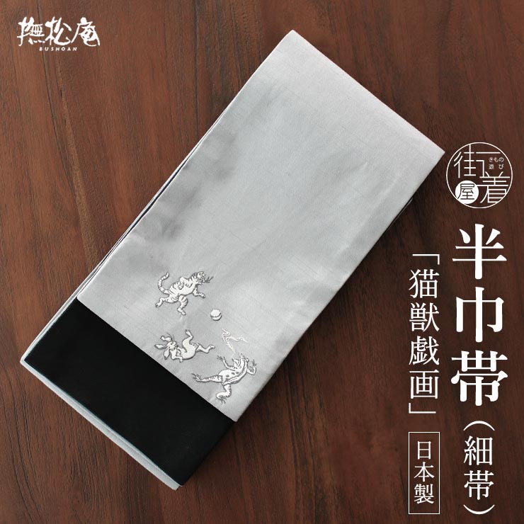 | 愛らしい動物たちが魅力的な 鳥獣戯画+猫の半巾帯 「撫松庵」 リバーシブル 半幅帯/細帯 <猫獣戯画> グレー <日本製> |