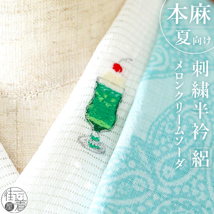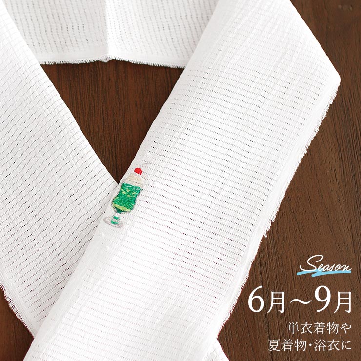 | 夏らしいワンポイントで涼感のある着こなしに 刺繍糸で描かれた、さくらんぼの乗ったメロンクリームソーダの半衿。 |
