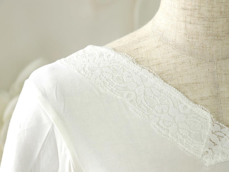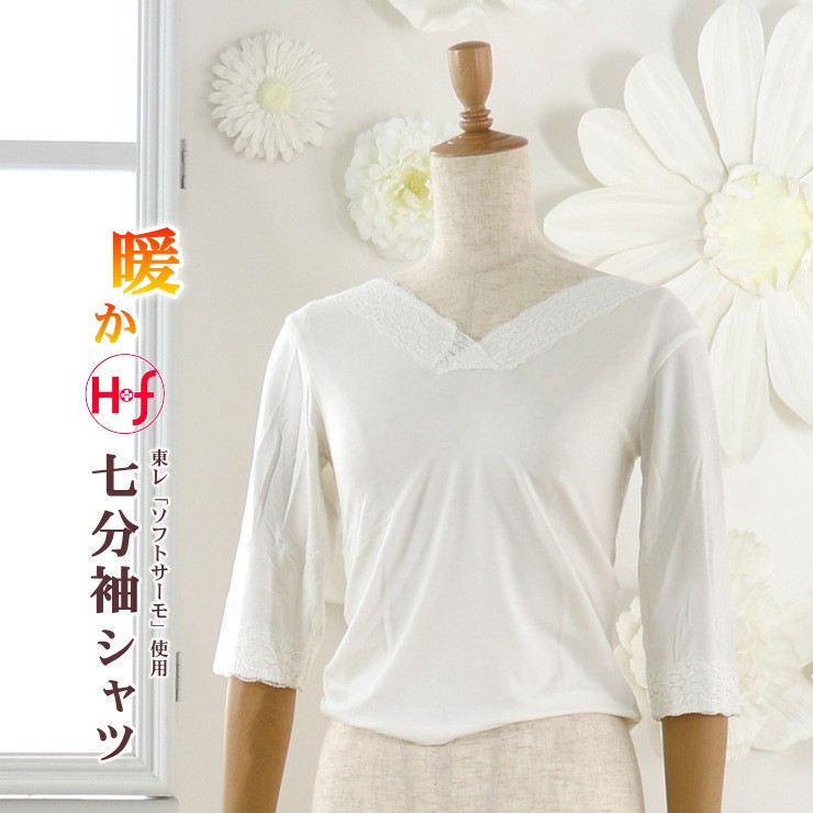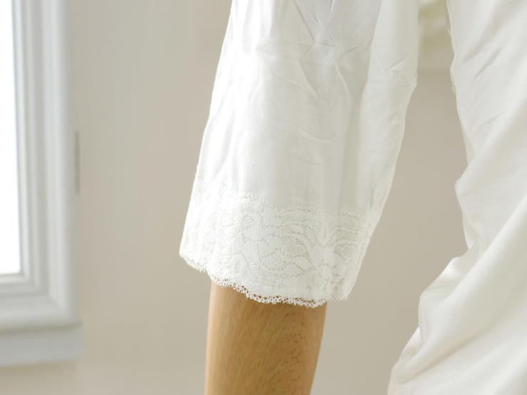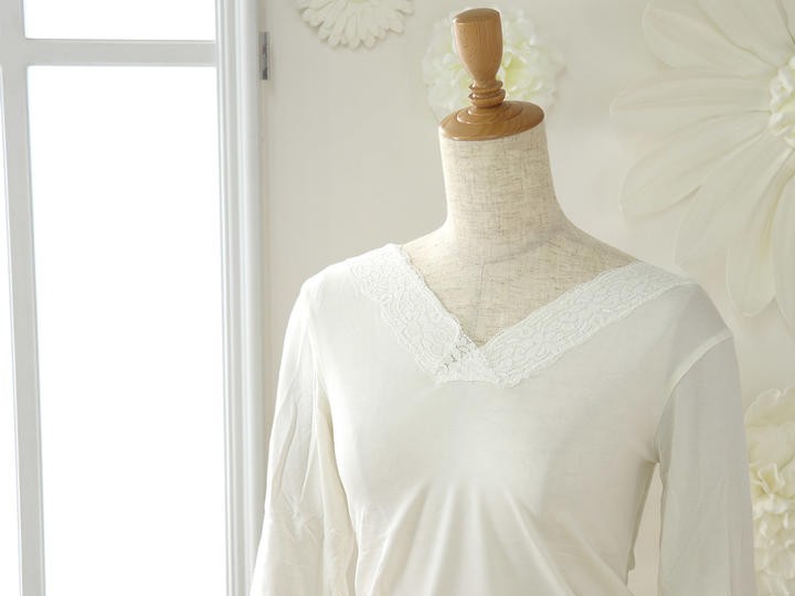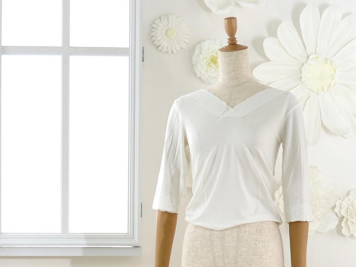 | 高級感のあるレースが袖と衿元についた上品なデザイン♪ 動きにフィットしてくれる七分丈のお袖はフレアー袖。ゆったり目で窮屈さを感じません。 女性にとってレースって年齢に関係なく憧れがありますよね♪こちらの肌着には袖と衿元に レースが施されていますので、着ていてちょっと嬉しくなります♪ |