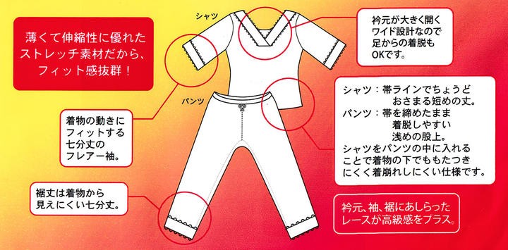 | 着付けのプロが監修した「ストレッチ×着物」のための設計! 着崩れしにくく動きやすいを実現した「ストレッチ素材」は薄くて伸縮性に優れ、フィット感も抜群! 身に着けていて、とても気持ちの良い和装インナーシリーズになります。 |