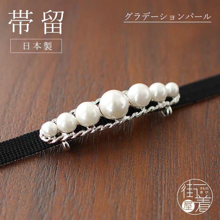 グラデーションに並んだパールが美しいラインを演出。品の良い「パール」を使った帯留め。パールとクリスタルの組み合わせですので、季節も問わずオールシーズンお使い頂けます。 お洒落ものにはもちろんのこと、訪問着等のフォーマルにもお洒落です。 |