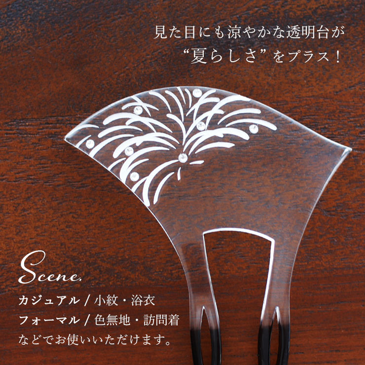バチ型かんざし 透明台に夜空に咲く花火柄