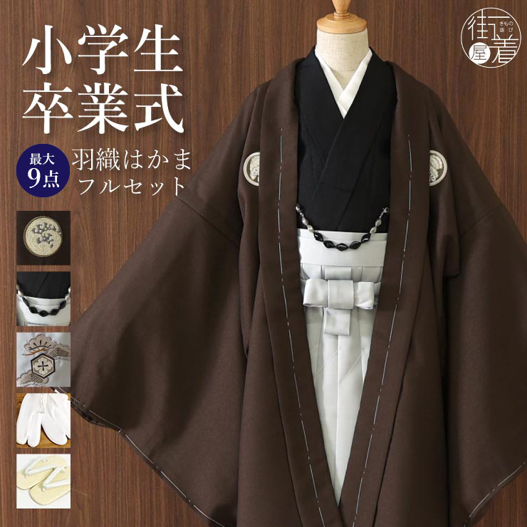 | 小町kids 男の子 袴セット 松に波 (羽織:ブラウン/着物:黒/袴:グレー) 羽織 袴 アンサンブル セット 着物 襦袢 半衿 羽織紐 卒業式 小学校 12歳 十三参り |