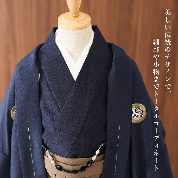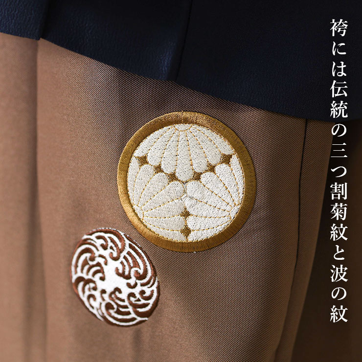 和装に慣れないお子様でも過ごしやすい、スカートタイプの行燈(あんどん)袴。袴にも三つ割の菊紋と波紋が施され、無地でシックな和服姿に華やかさをプラスしてくれます。