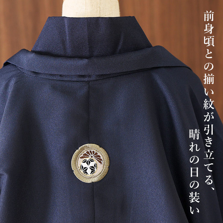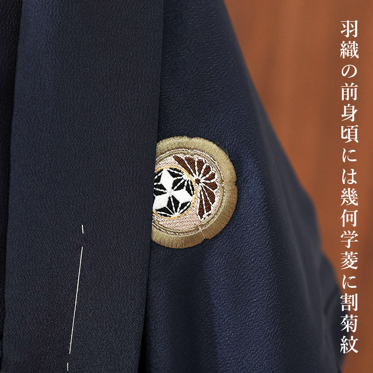 羽織の前身頃の2か所と背中に幾何学菱と割菊の洒落紋が入っています。無地の羽織に施された紋の刺繍は、華やかな印象に。大人顔負けの上品な姿に、お子様の確かな成長を感じる事ができます。