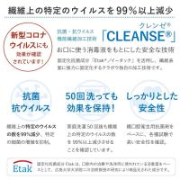新型コロナウイルスへの効果も確認されています。繊維状の特定のウイルスを99%以上減少し、特定の細菌の増殖も抑制する「クレンゼ」加工。その効果は、家庭洗濯を50回行っても、未使用時とほぼ同様の効果が保持されることが確認されています。 |