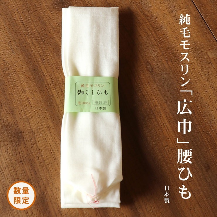 | 数量限定!純毛モスリン「広巾」腰ひも。 締まりの良いモスの腰紐は何本なっても重宝します! しかも、こちらは広幅タイプですので、太い分、締め付けも優しくおススメです♪ |