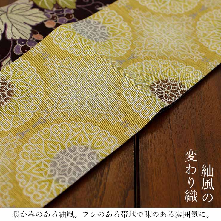| 暖かみのある紬風の帯地で味のある雰囲気に。 一般的な平織りの帯地ではなく、紬風の変わり織にすることで、少しフシのある風合いに仕上がりました。味のある紬風の帯は、伊勢木綿や正絹の着物にも大変よくお似合いです。 |