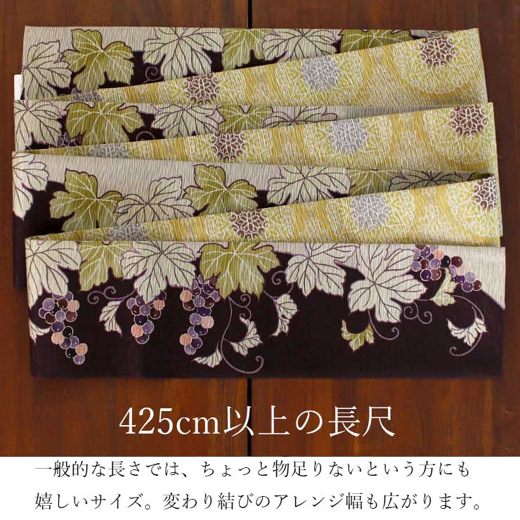 | 425cm以上の長尺でアレンジもたくさん楽しめます。 ちょっと長めの帯なので変わり結びのアレンジ幅も広がります。一般的な380cmの長さではちょっと帯の長さが足りないって方にも嬉しいですよね。 |