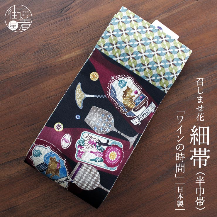 両面とも主役に。大活躍のリバーシブルデザイン。こちらの帯は両面使えるリバーシブル仕様。 この1本で2本分のコーディネートがお楽しみ頂けます。オモテ面はワインモチーフ、ウラ面はお花のようなタイル調のモダンな柄行。 |