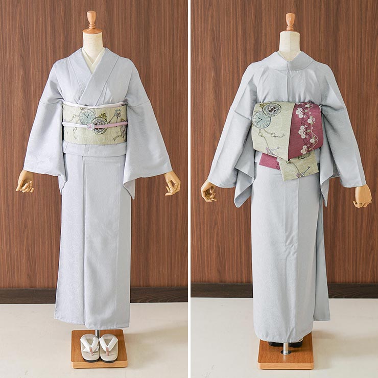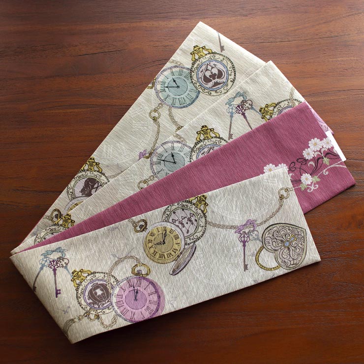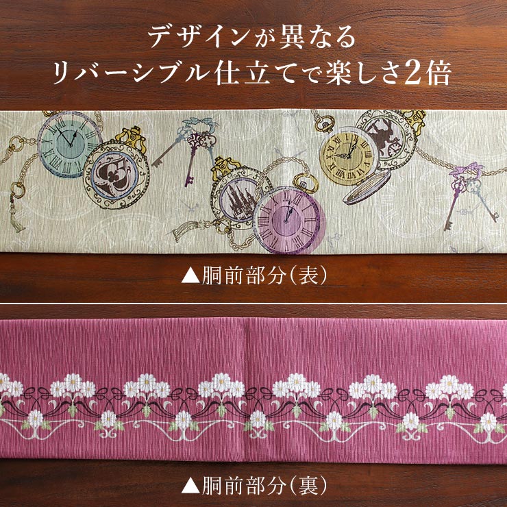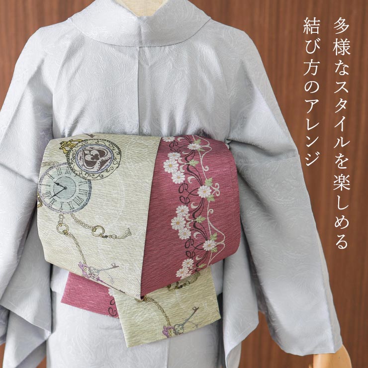 | 巻く位置によって表情を変える 両面主役級のリバーシブルデザイン。 こちらの帯は両面使えるリバーシブル仕様。 |