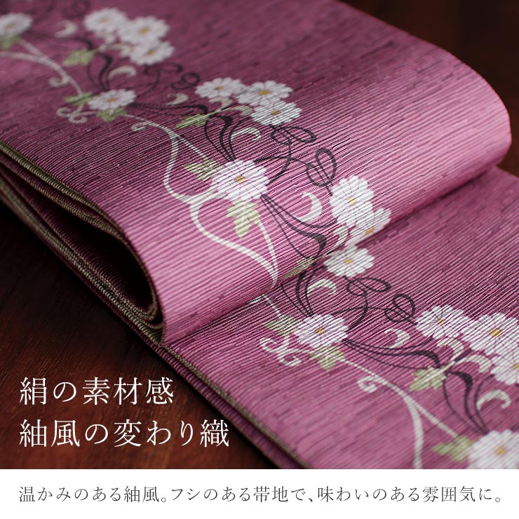 | 暖かみのある紬風の帯地で 味のある雰囲気に。 一般的な平織りの帯地ではなく、紬風の変わり織にすることで、少しフシのある風合いに仕上がりました。 |