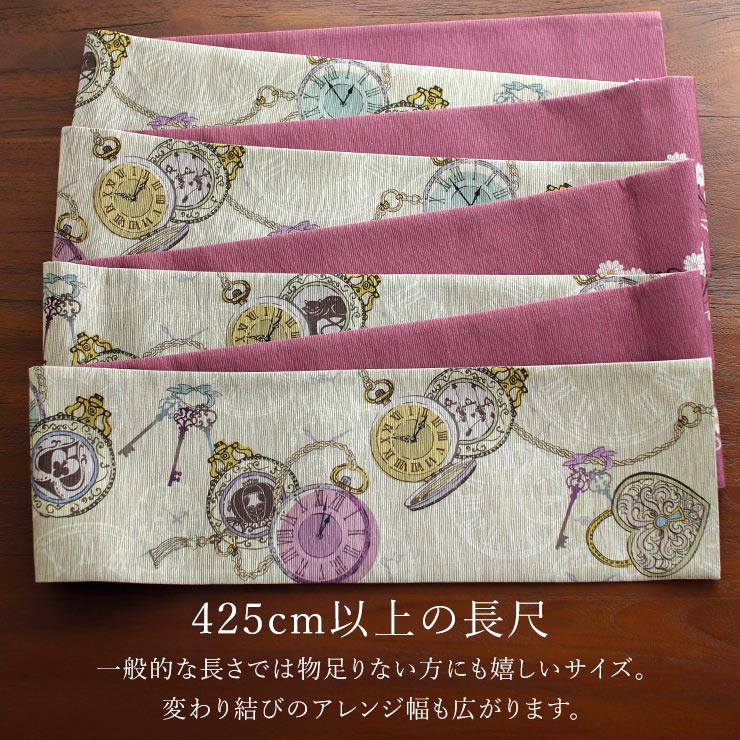 | 425cm以上の長尺で アレンジもたくさん楽しめます。 ちょっと長めの帯なので変わり結びのアレンジ幅も広がります。 |