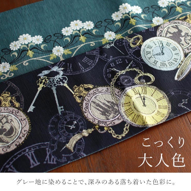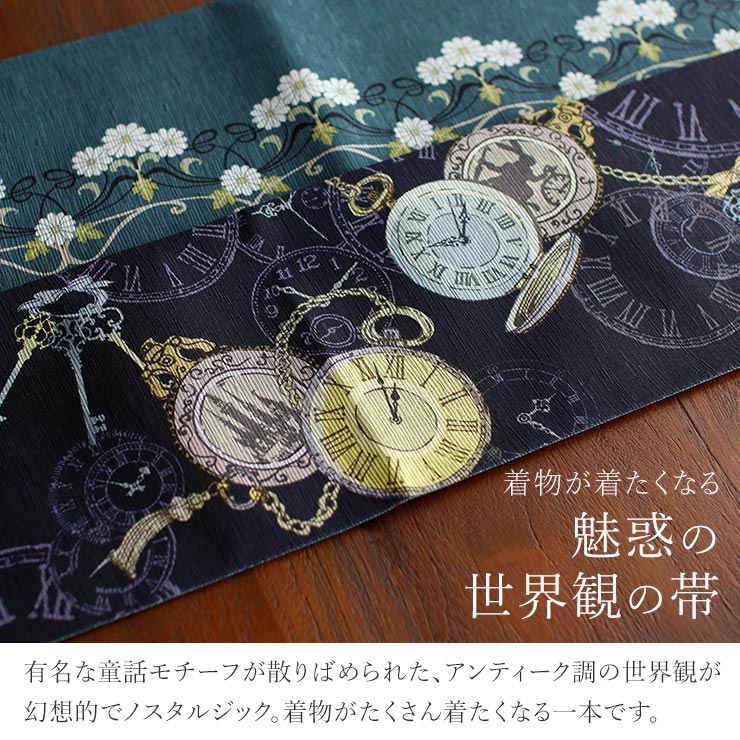 | 着物が着たくなる。 アンティーク感溢れる童話モチーフデザイン。 「ふしぎの国のアリス」「シンデレラ」…有名な童話に登場するモチーフを散りばめたデザインです。 |