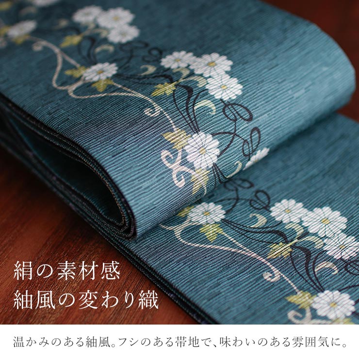 | 暖かみのある紬風の帯地で 味のある雰囲気に。 一般的な平織りの帯地ではなく、紬風の変わり織にすることで、少しフシのある風合いに仕上がりました。 |