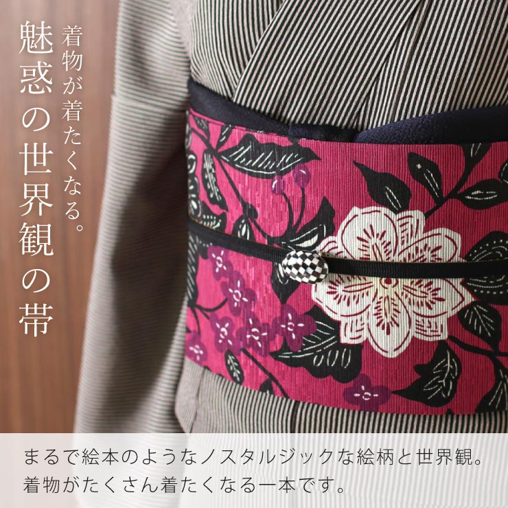 | カジュアルな着物に合わせて。キモノを楽しむ帯。 カジュアルシーンの気分を盛り上げる、魅力的な半巾帯です。絵本のようなノスタルジックなデザインに、こっくりと深みのある色彩と味わいのある表情の帯は、様々な着物に合わせてお楽しみいただけます。 紬や小紋の着物に合わせて、劇場での観劇やいつもよりちょっと良いお店でのランチ。デニム着物に合わせて、街へショッピングも素敵ですね。 |
