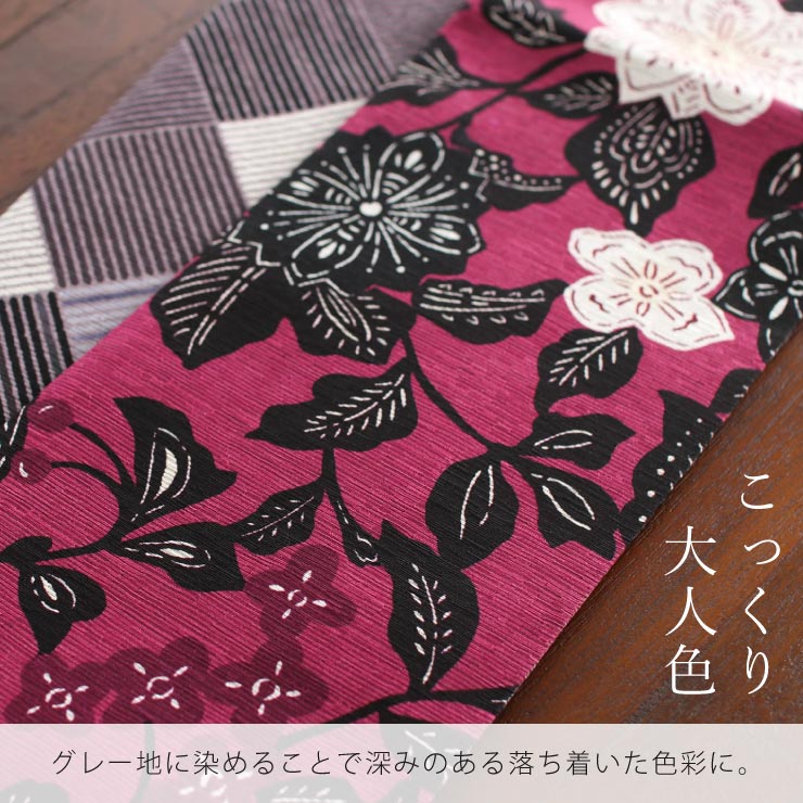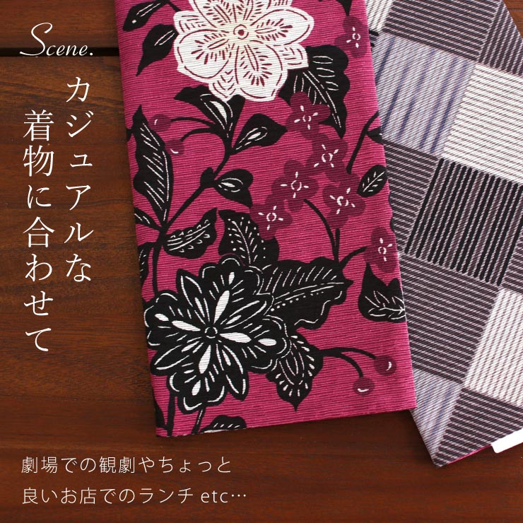 | 両面とも主役に。大活躍のリバーシブルデザイン。 こちらの帯は両面使えるリバーシブル仕様。 この1本で2本分のコーディネートがお楽しみ頂けます。片面は切り絵のようなモダンな更紗柄、もう片面は格子を用いた市松がお洒落なデザイン。 |
