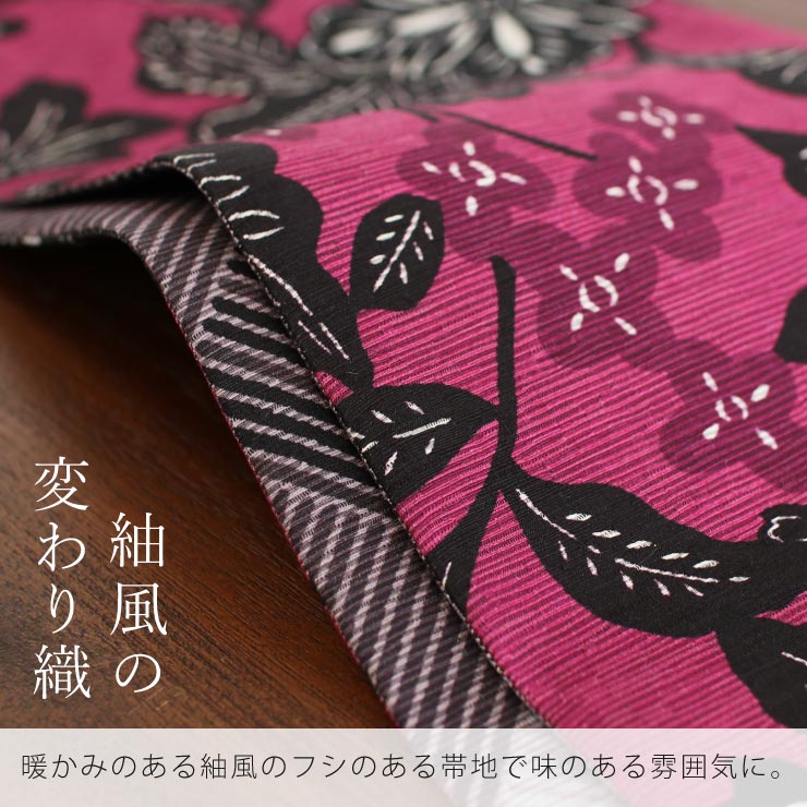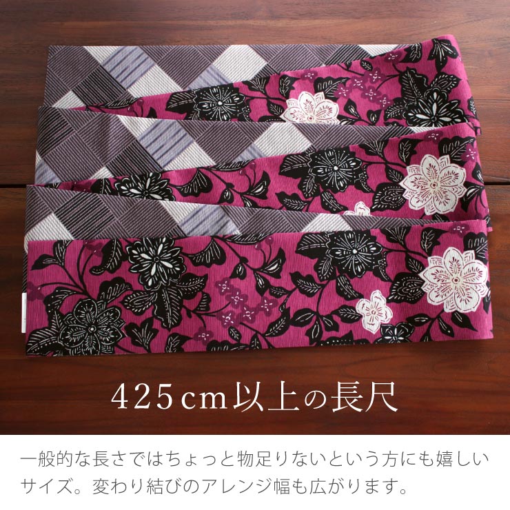 | 425cm以上の長尺でアレンジもたくさん楽しめます。 ちょっと長めの帯なので変わり結びのアレンジ幅も広がります。一般的な380cmの長さではちょっと帯の長さが足りないって方にも嬉しいですよね。 |